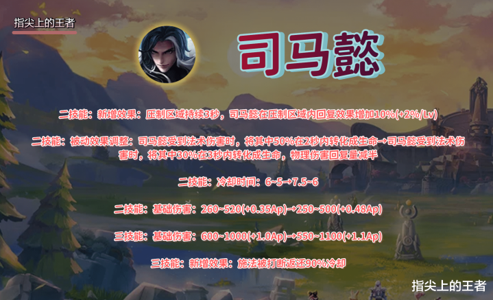 二技能的话压制范围增加到了3秒(调整前2秒),因为取消了能量条,也不涉及能量回收,所以是纯加强,司马懿在这个压制范围里,回复效果增加10%-20%,和被动以及噬神之书配合,续航会更强。 司马懿以前可以对受到的法伤进行转换,50%的伤害在两秒内转化生命,所以他对于法系英雄有着天然的克制能力。 而调整后,30%的伤害在3秒内转化生命,效率更低,比例更小,但新增了物理伤害的回复,只有15%,但这也是一个从无到有的过程,未来平衡英雄又多了一个方式。 二技能和大招的伤害都是削弱了基础数值,加强了后期的AP加成,并且大招被打断可以返还90%的冷却,这可能是司马懿玩家期待已久的调整了。 曹操