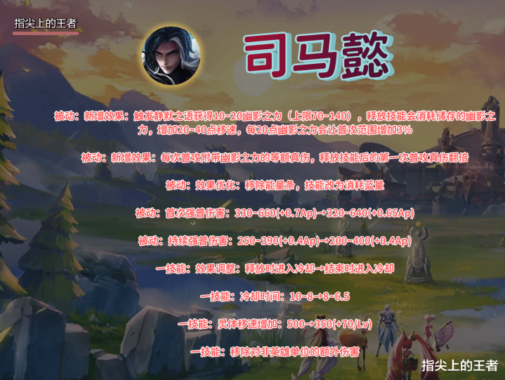 因为此前开启了共创环节,所以这次的司马懿改版就借鉴了许多玩家的灵感。 调整后的司马懿会因着幽影之力让镰刀实体化并常驻,且幽影之力都会提升自身的移速和普攻范围,同时幽影之力参与攻击,普攻附带幽影之力的等额真伤,且技能后的第一次普攻真伤翻倍。 幽影之力的加强让司马懿的强度会被提升很多,因为真伤的存在,对于护盾系英雄也不是很怕,所以这次取消了能量条,换成了蓝条,未来的司马懿对蓝buff也有了一定的需求。 强普和持续强普的伤害进行了调整,伤害削弱合情合理,毕竟现在刀刀强普,还有真伤加持。 一技能的话CD调整,技能结束后进入冷却,如果是1a秒放那就是加强,频繁用影子试探,可能CD会更高,同时削弱前期灵体的移速,加强了 后期的移速。 移除非英雄单位的额外伤害,略微降低了刷钱的效率。
