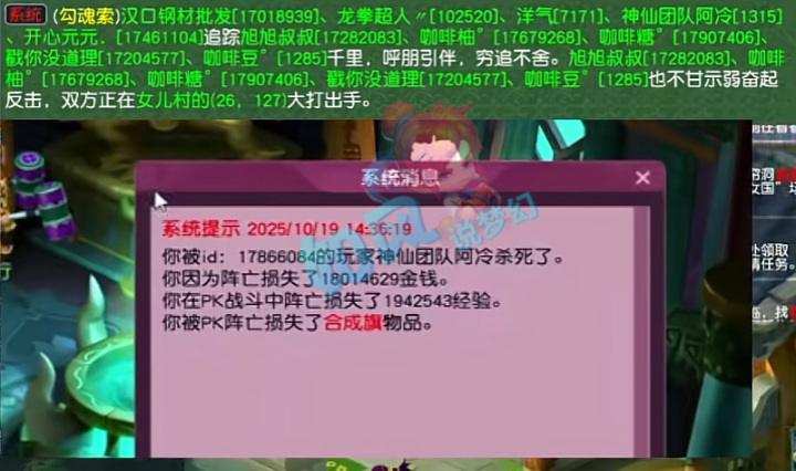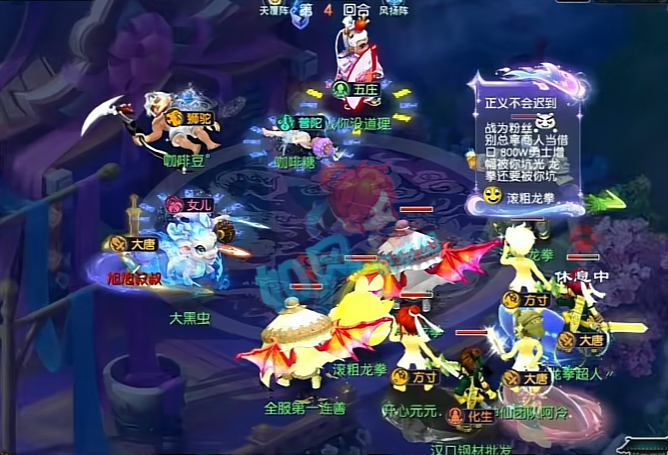 区内还出现了一个队伍,专门去勾魂了旭旭宝宝的练级队伍,号称是为了正义而战,龙拳这个区被他坑了。 |