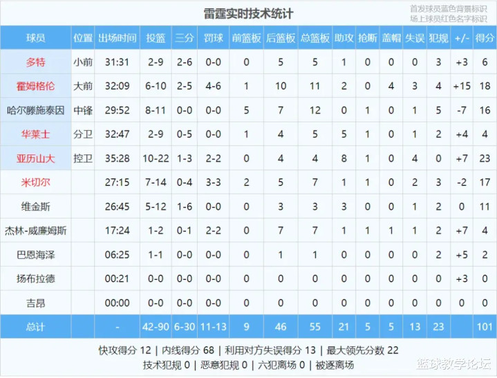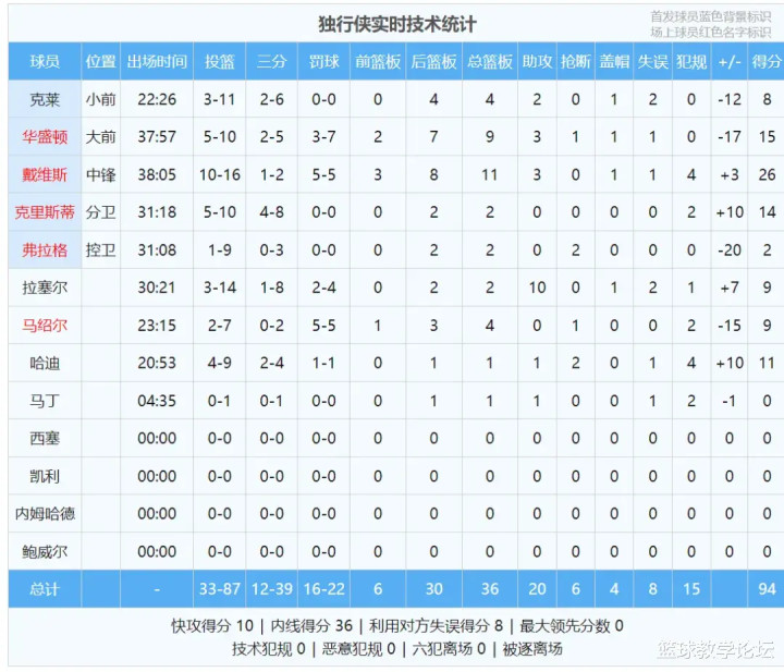 浓眉尽力了,本场出战38分钟,投篮16中10,三分2中1,罚球5中5,空砍26分11篮板3助攻1盖帽,正负值+3。独行侠弗拉格继续担任首发控卫,此役出战31分钟,投篮9中1,三分4中0,仅得2分2篮板2抢断0助攻,正负值-20全场最低!