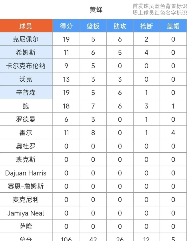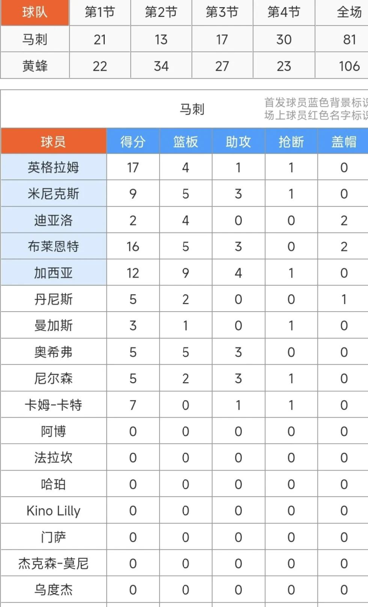 下半场易边再战!黄蜂队依然火力四射,今天多点开花六人得分上双,克尼佩尔、希慕斯、辛普森、鲍等人轮换进攻得分,率队稳扎稳打处于大比分领先优势;马刺队大卫.琼斯、英格拉姆、布莱恩特也是先后发力奋起直追,无奈比分相差甚远,只能饮恨吞下失利!双方最终一番厮杀比赛结束,黄蜂队106:81轻松击败马刺队赢得胜利!
