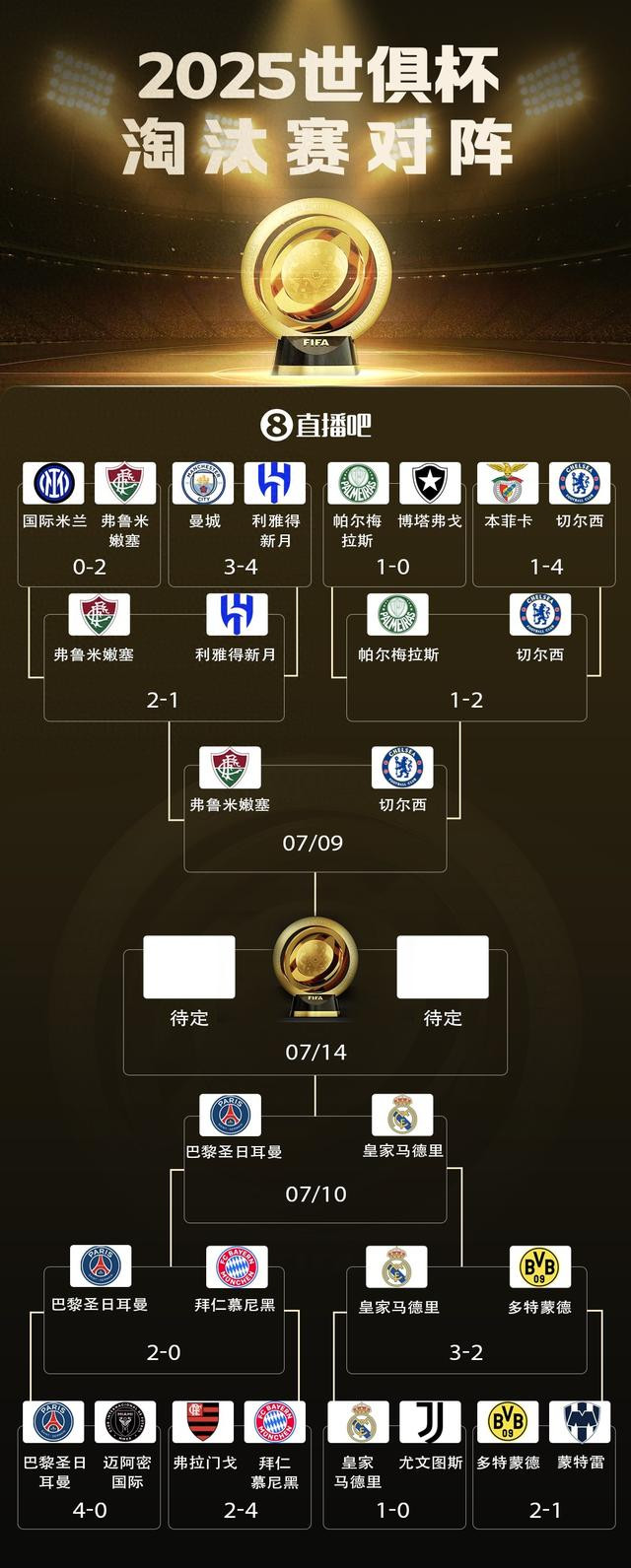 直播吧07月06日讯 世俱杯半决赛对阵出炉,弗鲁米嫩塞vs切尔西,巴黎vs皇马。 世俱杯夺冠赔率更新,巴黎继续领跑,皇马第二,切尔西第三。 世俱杯冠军最新赔率: 1、巴黎,2.37 2、皇马,2.75 3、切尔西,3.75 4、弗鲁米嫩塞,13 【上咪咕,看世俱杯!】 |