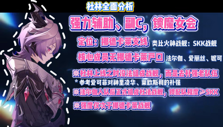 辅助形态下的杜林挂火范围大、倍率低。 队伍中触发火相关反应时,会降低除冰水之外的对应元素抗性;减抗效果在队伍组出双魔女时翻倍。该形态用于给前台c打火底,自己输出不高,作用等效超载队里的火主/火神、小玛和莱欧融化队里的香菱(但是不减冰水抗性)。这时候是杜林给主c打工,他自己打不出反应,打不出反应,打不出反应!除减抗之外,最新消息说该形态本体拐力还有增伤,数值机制未知。