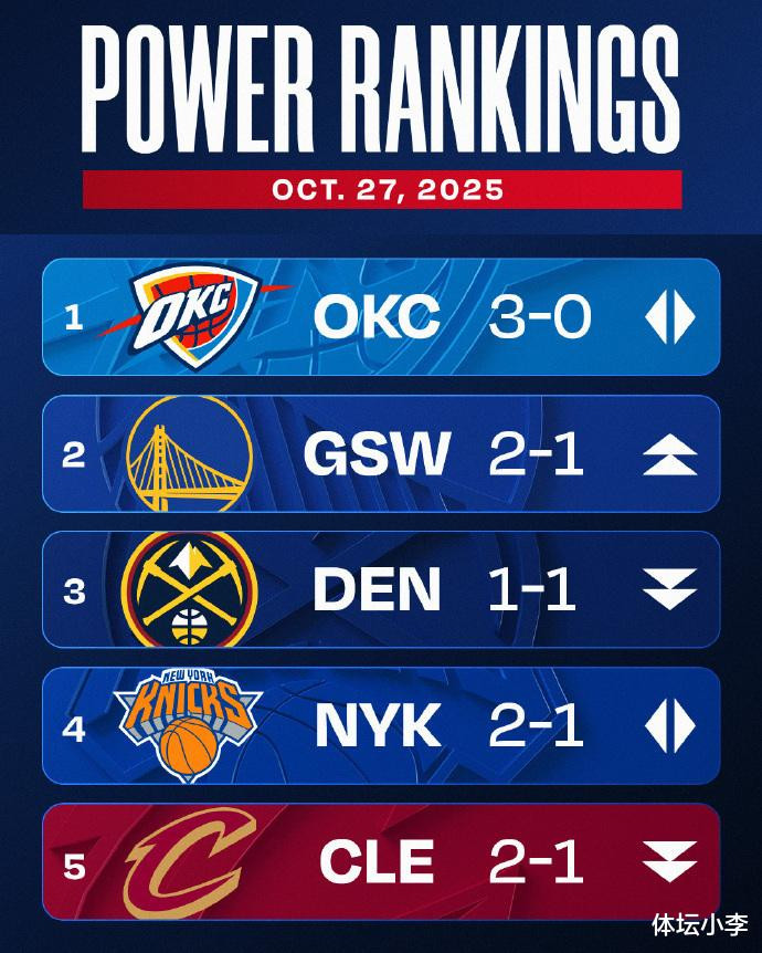 新赛季第一周打完,实力榜也是进行了更新,排名也发生了很多变化。这当中卫冕冠军依然高居第一的位置,勇士则冲到第二,掘金来到第三,尼克斯依然排在第四,接下来则是骑士、湖人、森林狼、马刺、快船和活塞。前10当中西部球队占据7个,新赛季西部的竞争将会变得更加激烈。 |