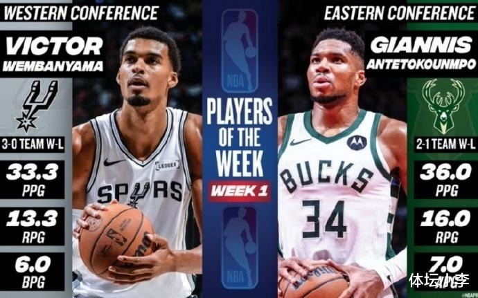 NBA官方宣布,字母哥和文班亚马分别当选了东西部第一周的周最佳球员。这也是没有任何质疑的,在第一周两人的表现十分强势,字母哥场均轰下36分16篮板7助攻,带领雄鹿取得2胜1负的成绩;文班亚马则场均轰下33.3分13.3篮板6封盖,带领马刺取得3胜0负的战绩。此外,库里、东契奇、亚历山大、马克西、布伦森等人获得了提名。
